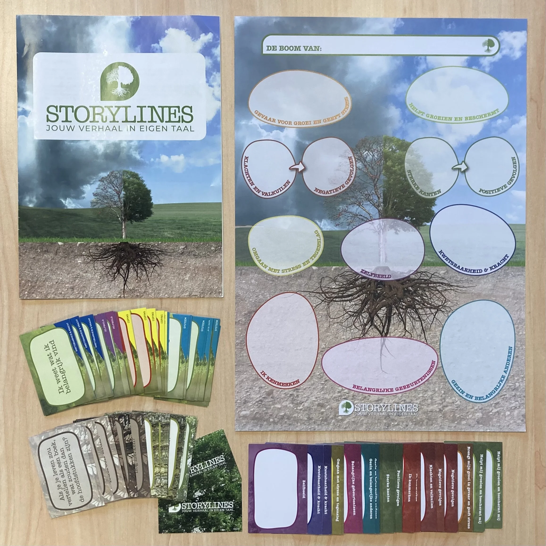 Bij deze set krijg je een handgemaakte houten doos (34x34x13cm) met een 3D-model van de Storylines boom. De doos bestaat uit 2 losse delen die in elkaar geplaatst worden waardoor een interactief decor ontstaat.